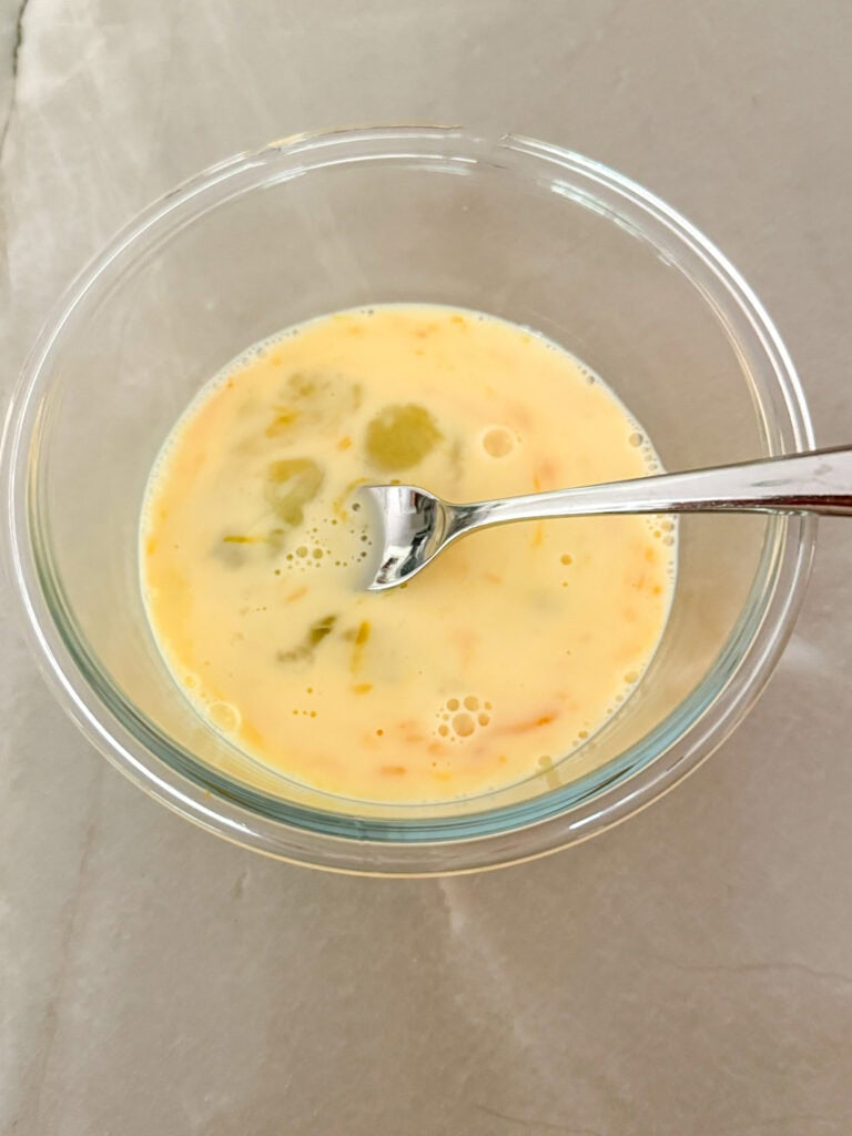 - In a small bowl, whisk 2 eggs and 1/2 cup of milk to create an egg mixture.
