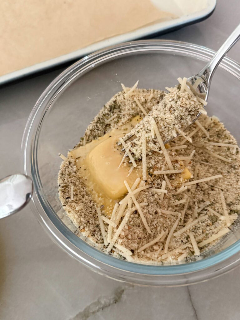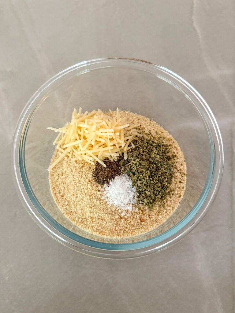 - In a separate bowl, combine 1 cup of bread crumbs, 1/4 cup shredded parmesan cheese, 1T of Italian seasoning, 1/8 t garlic powder, 1/4t salt and 1/8t black pepper. Stir until well mixed.