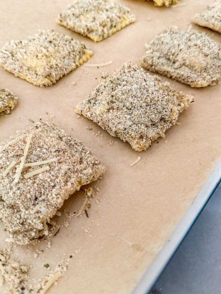 - Lay breaded ravioli on lines baking sheet and freeze for at least 20 minutes. Tip: you can prep these ahead of time and let them freeze for several hours or even overnight. Just cover them with tin foil or plastic wrap to prevent freezer burn.