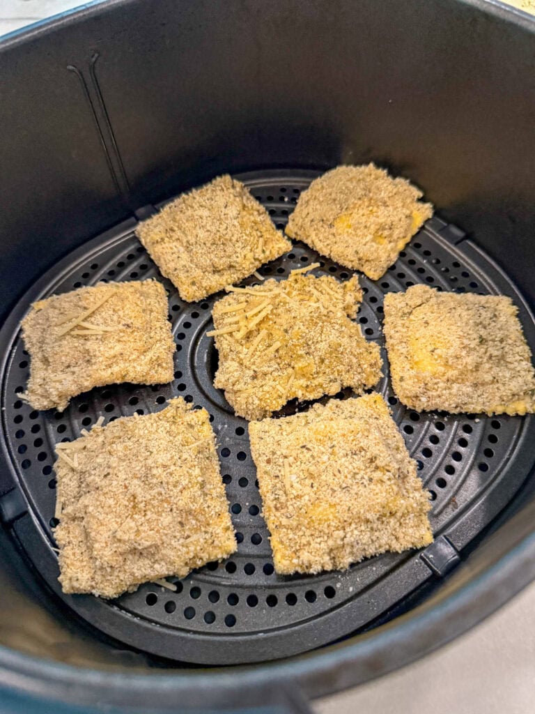 Reheat instructions: Place cold ravioli back in the air fryer at 375 °F for 2–4 minutes, until warm and crispy. If frozen, add another 1-2 minutes to cook time.